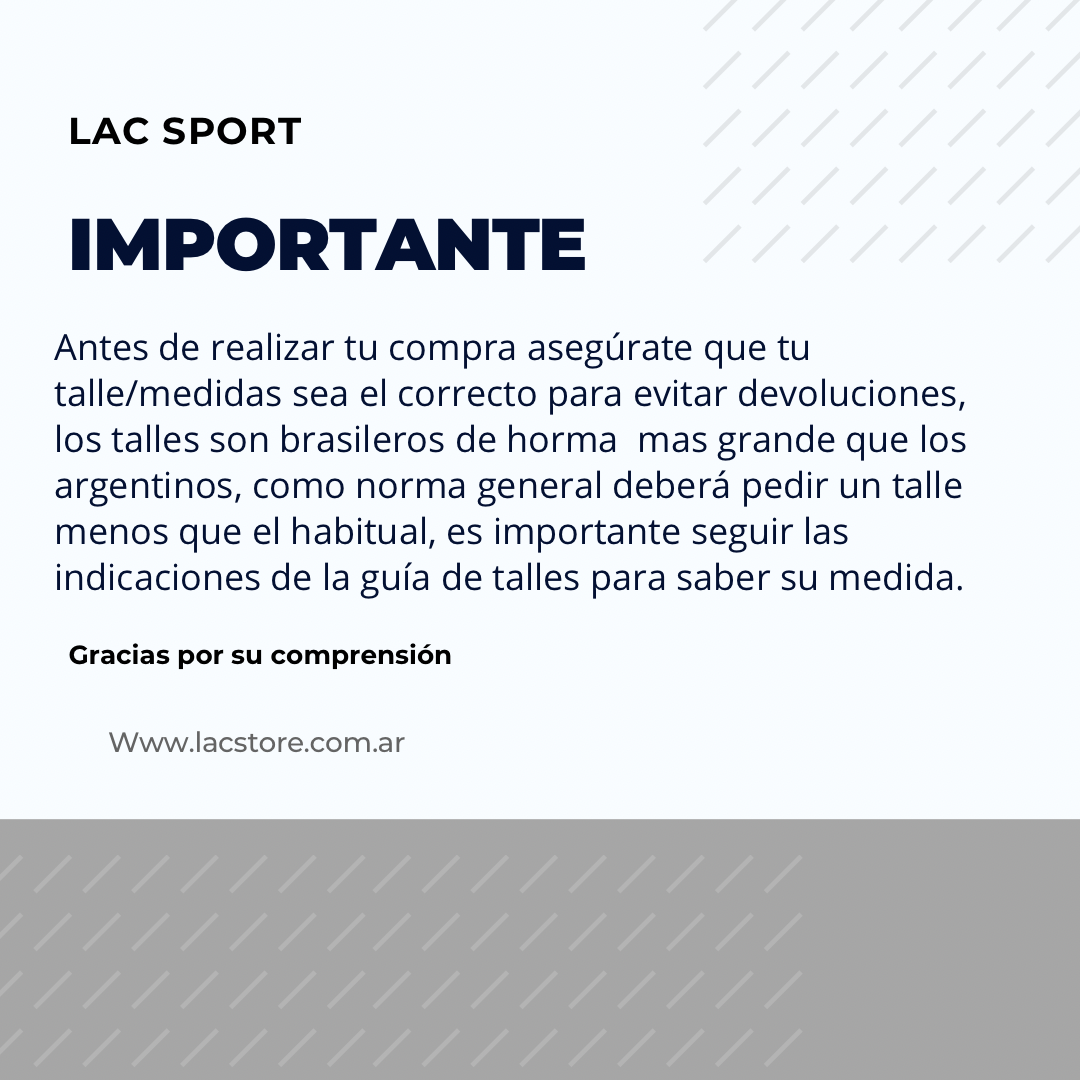 Antes de realizar tu compra asegúrate que tu talle/medidas sea el correcto para evitar devoluciones, los talles son brasileros de horma un poco mas grande que los argentinos, como norma general deberá pedir un talle menos que el habitual, es importante seguir las indicaciones de la guía de talles para saber su medida.